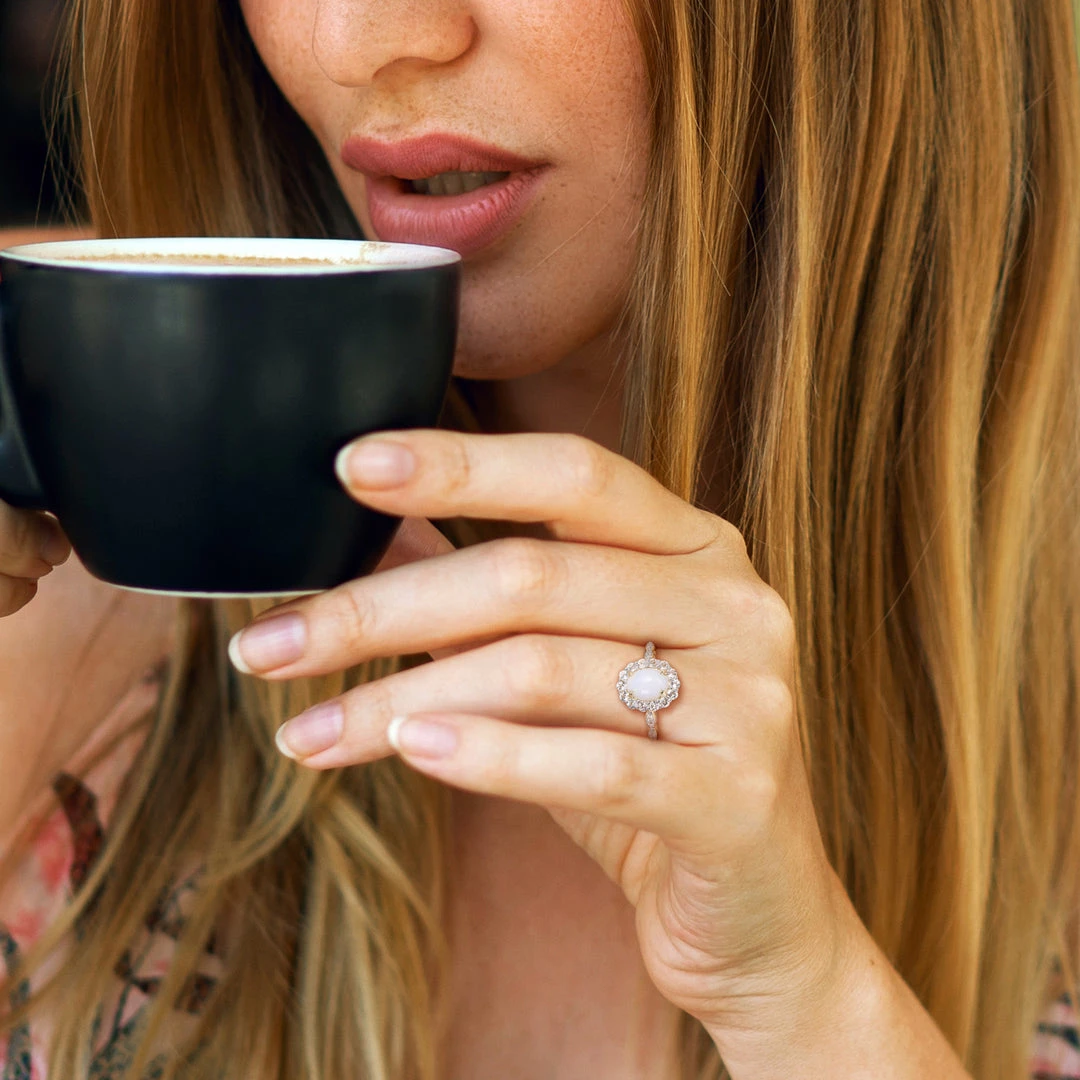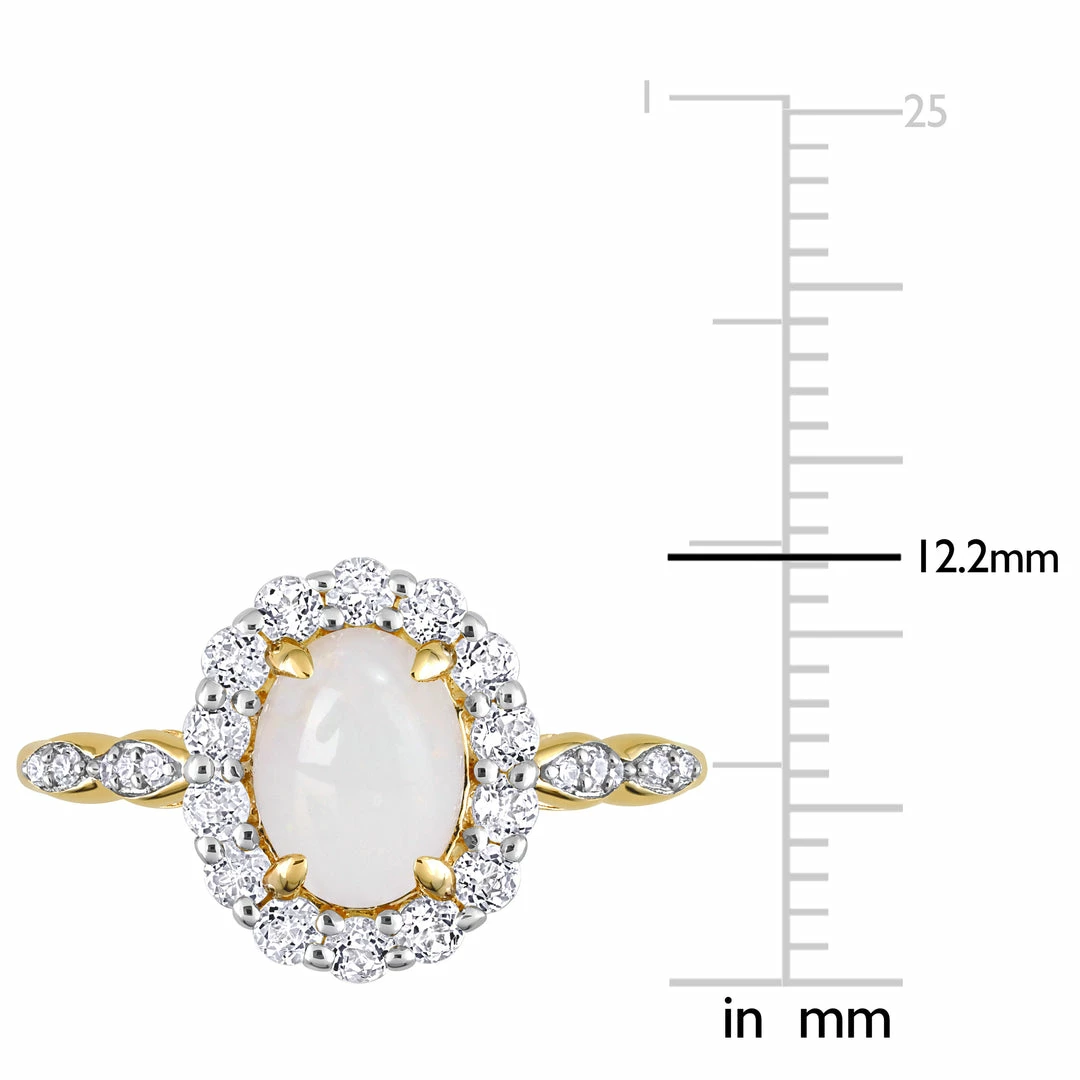 Accessorize elegantly with this classic Oval Opal, White Topaz, and Diamond Accent Halo Ring. Crafted in lustrous yellow gold, this chic ring features an oval-cut, prong-set opal (8 x 6 mm) at the center, beautifully encased by 14 created white topaz gemstones (2 x 2 mm) in a halo design and 10 round-cut, pave-set diamonds (G-H, I1-I2) extending on the band. Polished brilliantly, this ring is a versatile and timeless piece that you will look graceful in.