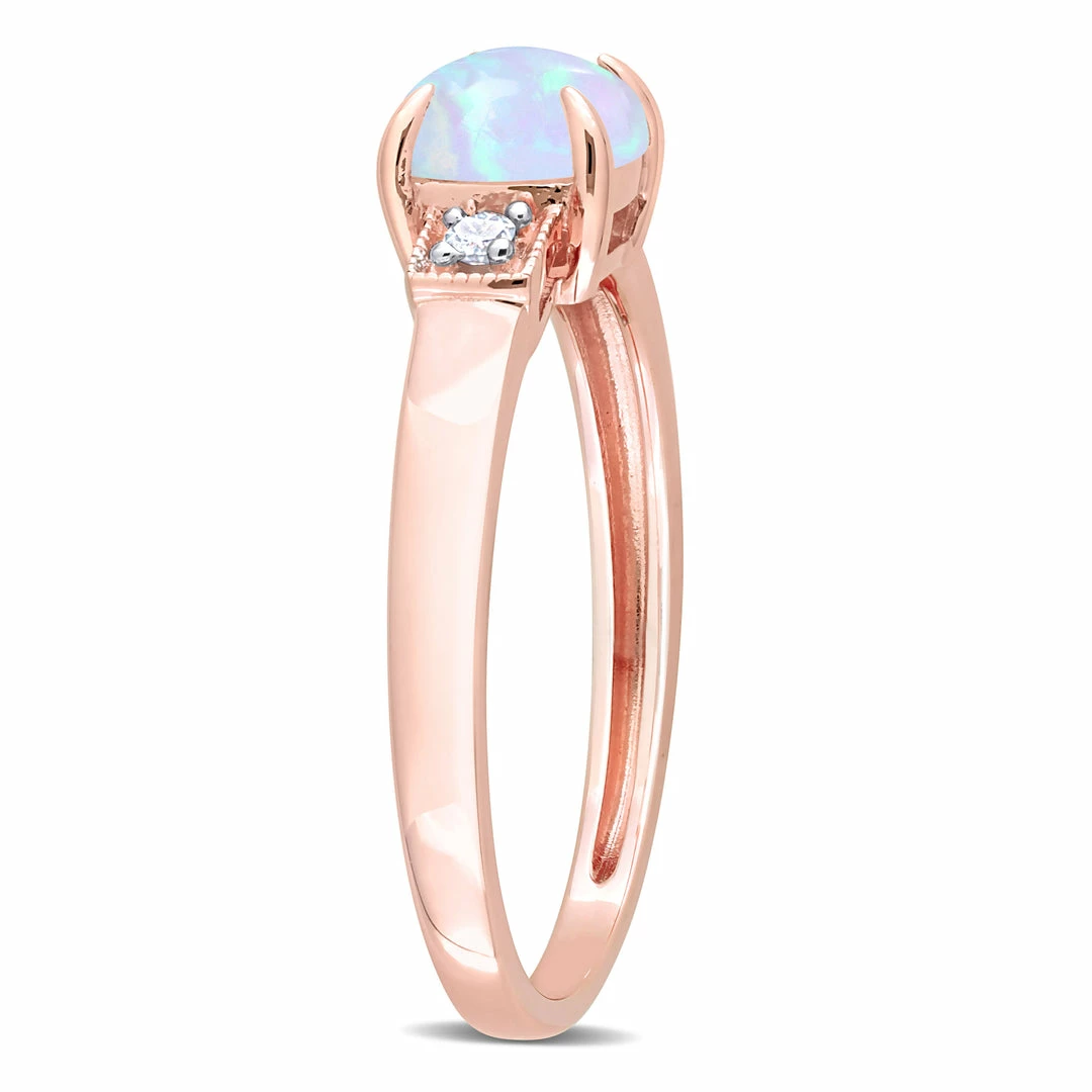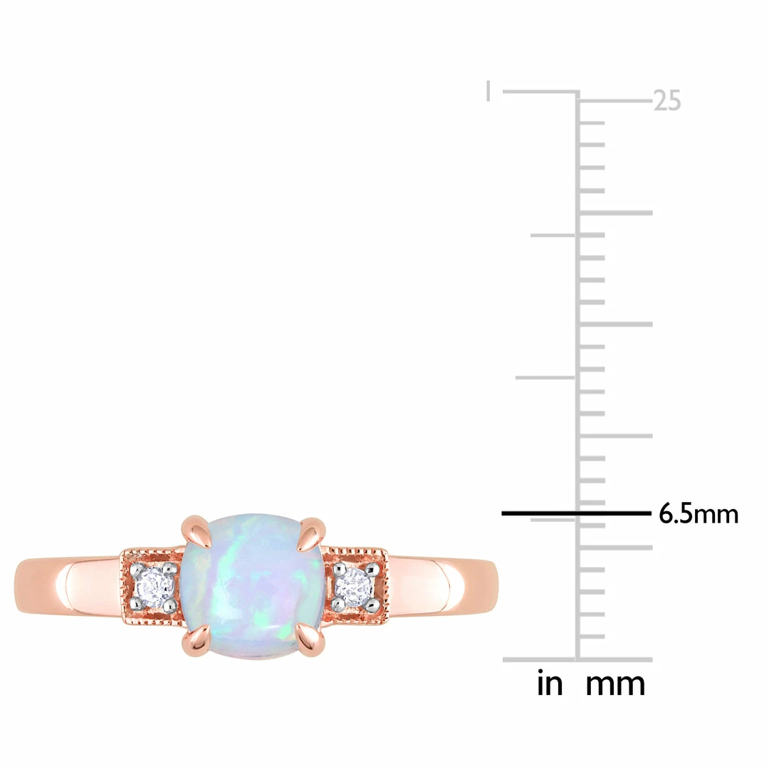 Gift yourself this exquisite Ethiopian Blue Opal and Diamond Accent Three-Stone Ring and make it your prized possession. Crafted in lustrous rose gold, this classic ring features a cushion-cut, prong set, blue Ethiopian-opal gemstone (6 x 6 mm) studded at the center with two pave-set diamonds (H-I, I3) embellished on either side of the stone. Enhanced with a milgrain finish, this elegant ring is perfect for a poised look.