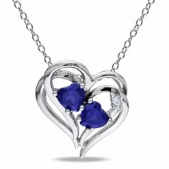 Celebrate the first date after your wedding with this charming Double Heart Pendant with Chain. Crafted in lustrous sterling silver, this captivating pendant features two heart-shape, prong set, created blue sapphire gemstones (5 x 5 mm) and a round-cut, prong set, diamond (G-H-I, I3) placed in the two entwined hearts. Polished to brilliance, this exquisite pendant is suspended on an 18-inch round cable chain secured with a spring ring clasp. An accessory that will represent your destiny.