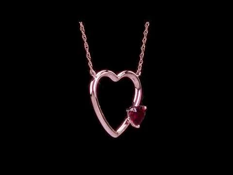 This pretty heart pendant from the Collection, is crafted in 10-karat rose gold and features a heart cut, prong set garnet gemstone placed on the edge of the open heart motif.Enhanced with a high polished finish and suspended on a 17-inch rope chain, this gemstone necklace makes a perfect gift either for yourself or for someone you love.A beautiful addition to any jewelry collection.Style – Pendant Gemstone colors – Red Gemstone shapes – Heart 1 prong set heart cut garnet gemstone Total gemstone weight – 1/2 carat Metal – 10k pink gold Finish – High polish Chain – Rope Chain length – 17 inches Clasp – Spring ring Metal weight – 2 grams Pendant dimensions – 17 mm wide x 16.8 mm long Necklace dimensions – 0.9 mm wide x 17 inches long All carat weights and measurements are approximate and may vary slightly from the listed dimensions.Treatment code N (garnet).See Treatment Guide for further information.