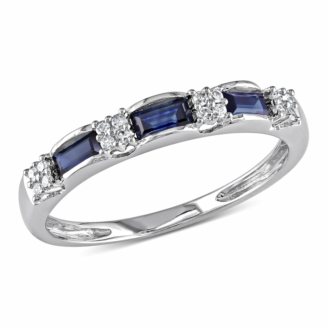 Give your favorite outfit an extra glamorous touch with this stunning eternity style anniversary band. This stackable ring features three flawless baguette-cut sapphires along with round diamond clusters in hues of blue and white for an elegant look. A 10k white gold wedding band with high polish provides added beauty, and the simplicity of the design is ideal for those who like just a bit of shimmer. This piece easily stacks with other rings for a perfect look, whether you are dressing up a family heirloom or wearing it alongside your existing wedding ring. Sapphires are also the September birthstone, making this piece an ideal birthday gift.