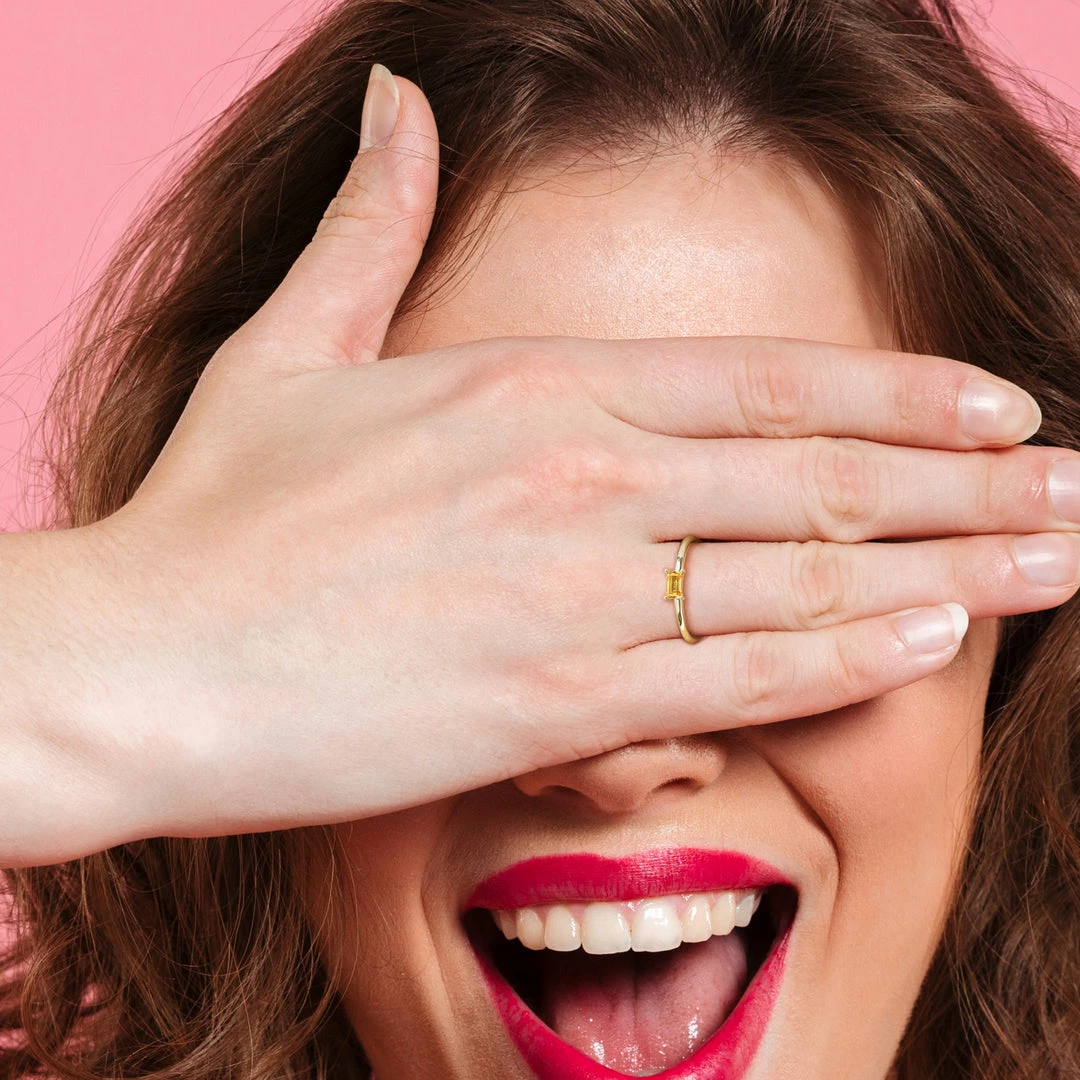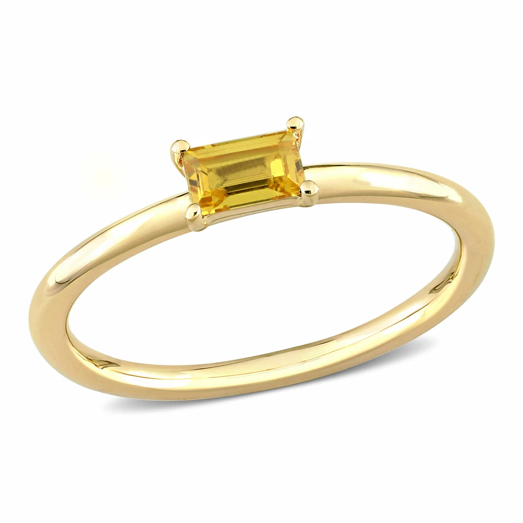This pretty solitaire stackable baguette ring is crafted in 10-karat yellow gold and features baguette-cut, prong-set yellow sapphire gemstone studded at the center. Enhanced with a high polished finish, this stackable ring is the perfect addition to any jewelry collection. Pair this trendsetting ring with any business or casual outfit and look elegant.