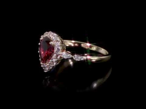 Stand out in the crowd with this striking pear halo ring.Crafted in lustrous yellow gold, this exceptional ring features a pear cut, prong set garnet decorated with a halo created by 13 prong set white topaz gemstones and four pave set diamonds (G H-I, I2-I3) embellished halfway on both sides of the band in a marquise design.Finished with a polished shine, this glitzy ring is a perfect accessory for a red carpet look.