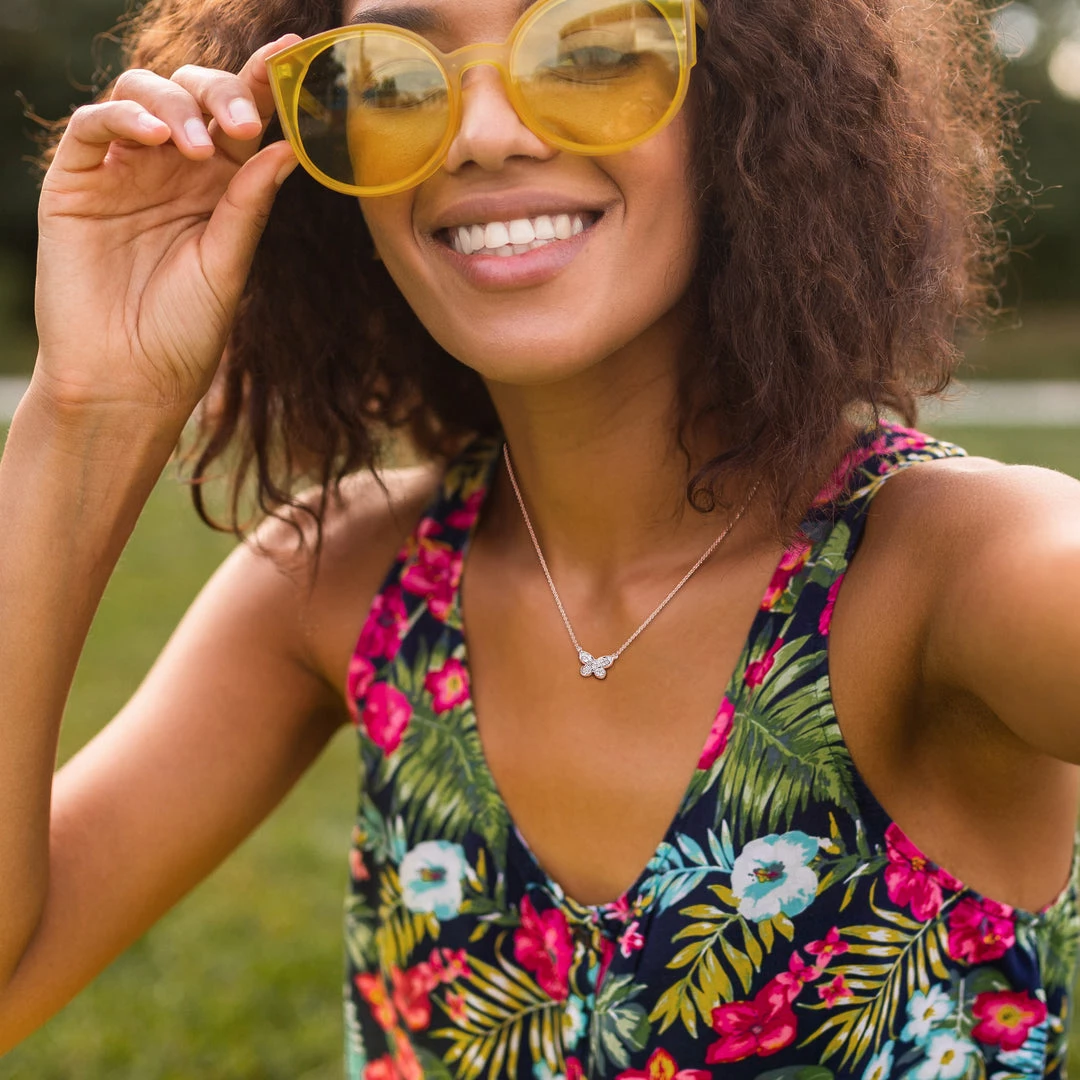 This delicate cluster butterfly necklace is crafted in 10-karat rose gold. This beautiful stationed necklace features 26 round-cut, prong-set diamonds clustered together in a butterfly design. Enhanced with a high polish finish, this gorgeous necklace is suspended on a 17-inch rope chain and is secured with a spring ring clasp. Bold and beautiful, this twinkling butterfly necklace is the perfect gift for your beloved. A great addition to any jewelry collection.