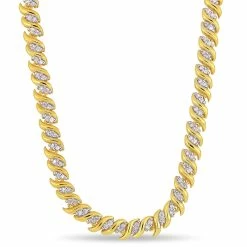 This lustrous swirl diamond tennis necklace is crafted in yellow plated sterling silver and features 200 round-cut, prong set glistening diamonds in a unique S-link design, perfect to grace all occasions. Instantly add a touch of elegance, sophistication and class to any ensemble with this stunning diamond necklace. A perfect versatile choice either for yourself or as a special gift for someone you love.