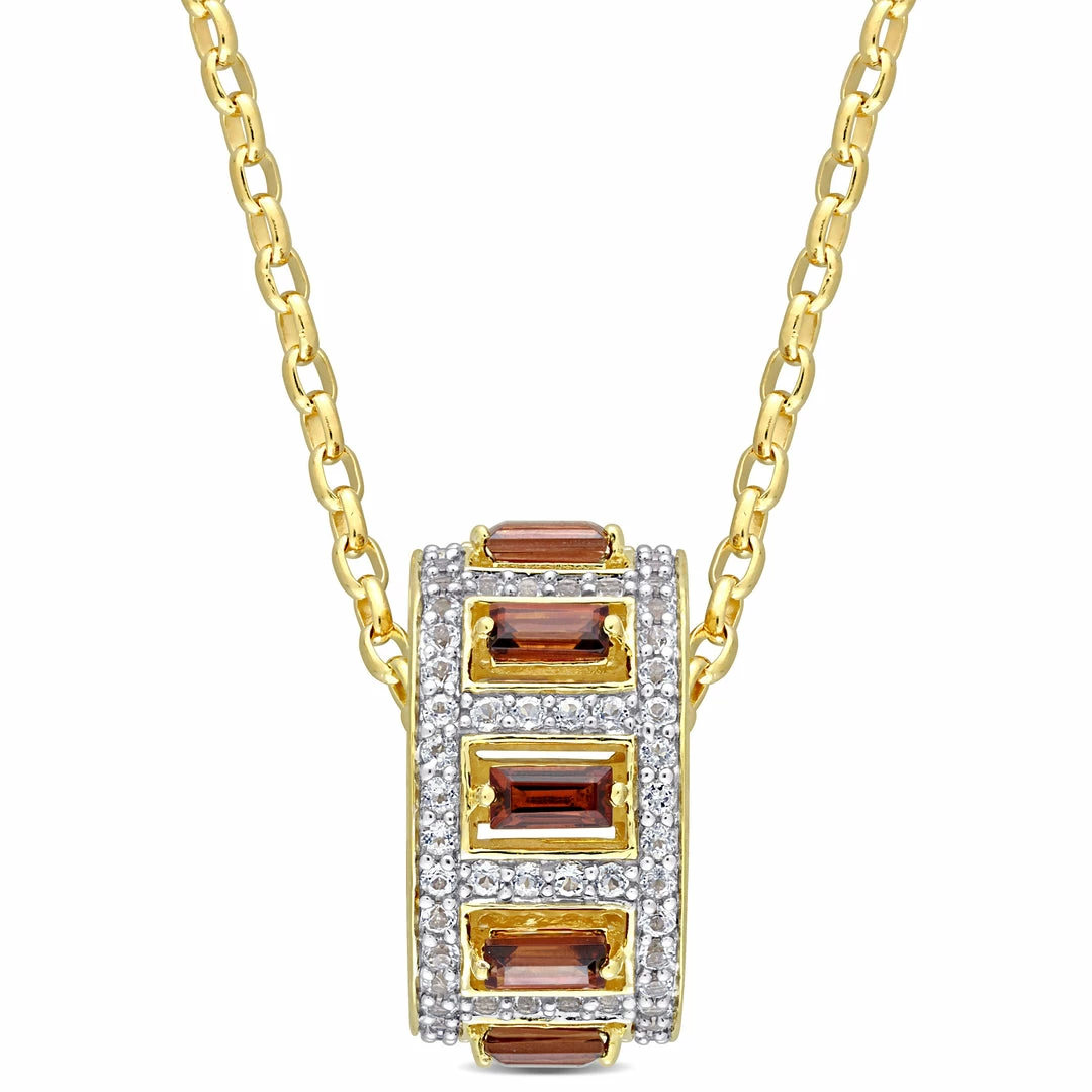 This lovely station pendant with chain is crafted in lustrous yellow plated sterling silver and features nine baguette cut, prong set garnet gemstones alternating with 106 round cut, pave set white topaz gemstones studded at both the edges.Suspended on 18-inch rolo chain and secures with a loster clasp.Coordinate this pendant with its matching earrings and ring set and complete your glamorous look.This flickering and timeless pendant with chain is sure to add a burst of color and class to any occasion.Style – Pendant Gemstone colors – Red, white Gemstone shapes – Round, baguette Nine prong set baguette cut garnet gemstones Gemstone weight – 1 2/5 carats 106 pave set round cut white topaz Gemstone weight – 1 carat Total gemstone weight – 2 1/2 carats Metal – Yellow silver Finish – High polish Chain – Rolo Chain length – 18 inches Clasp – Lobster claw Metal weight – 4.65 grams Pendant dimensions – 9.5 mm wide x 18.4 mm long Necklace dimensions – 1.85 mm wide x 18 inches long All carat weights and measurements are approximate and may vary slightly from the listed dimensions.Treatment code N (white topaz, garnet).See Treatment Guide for further information.