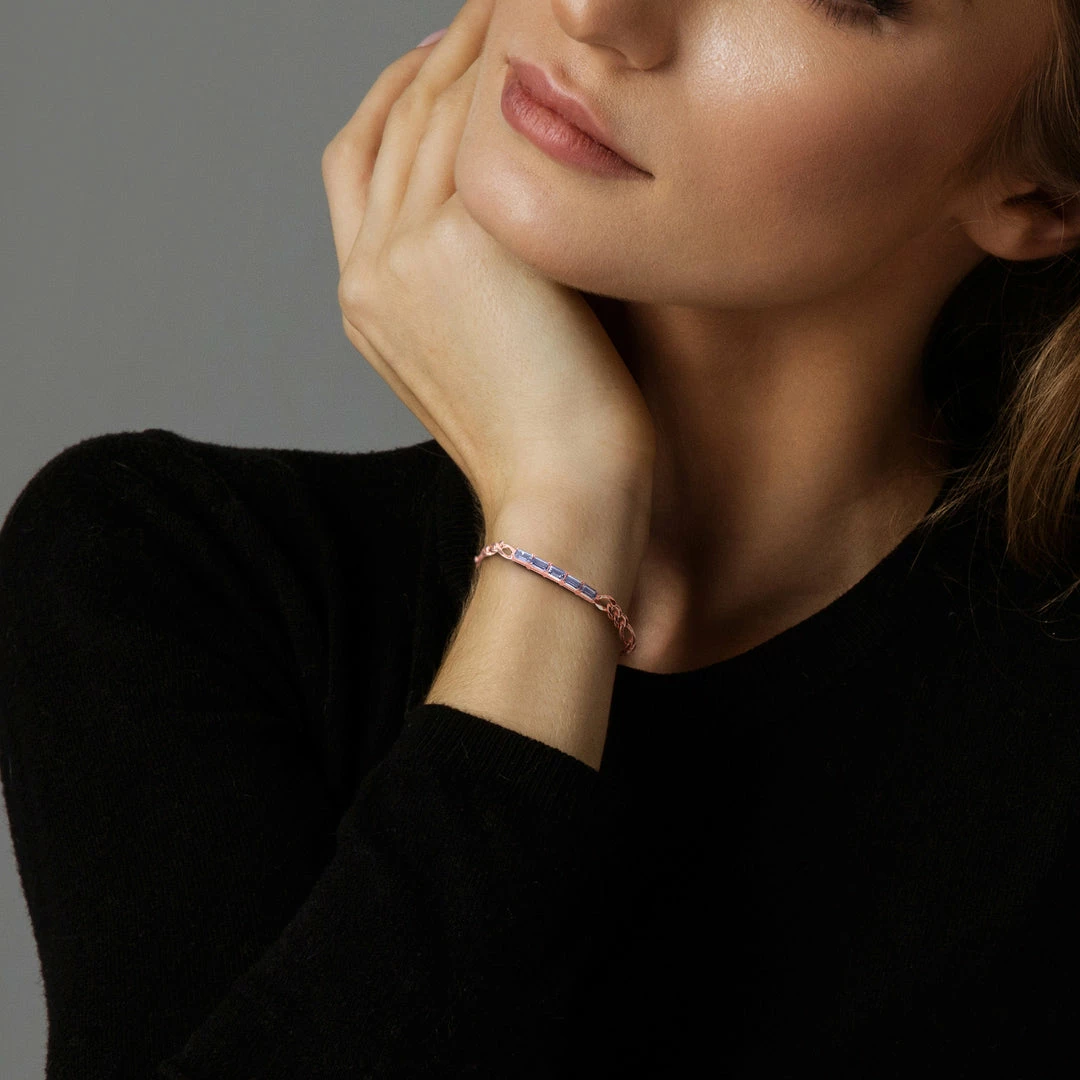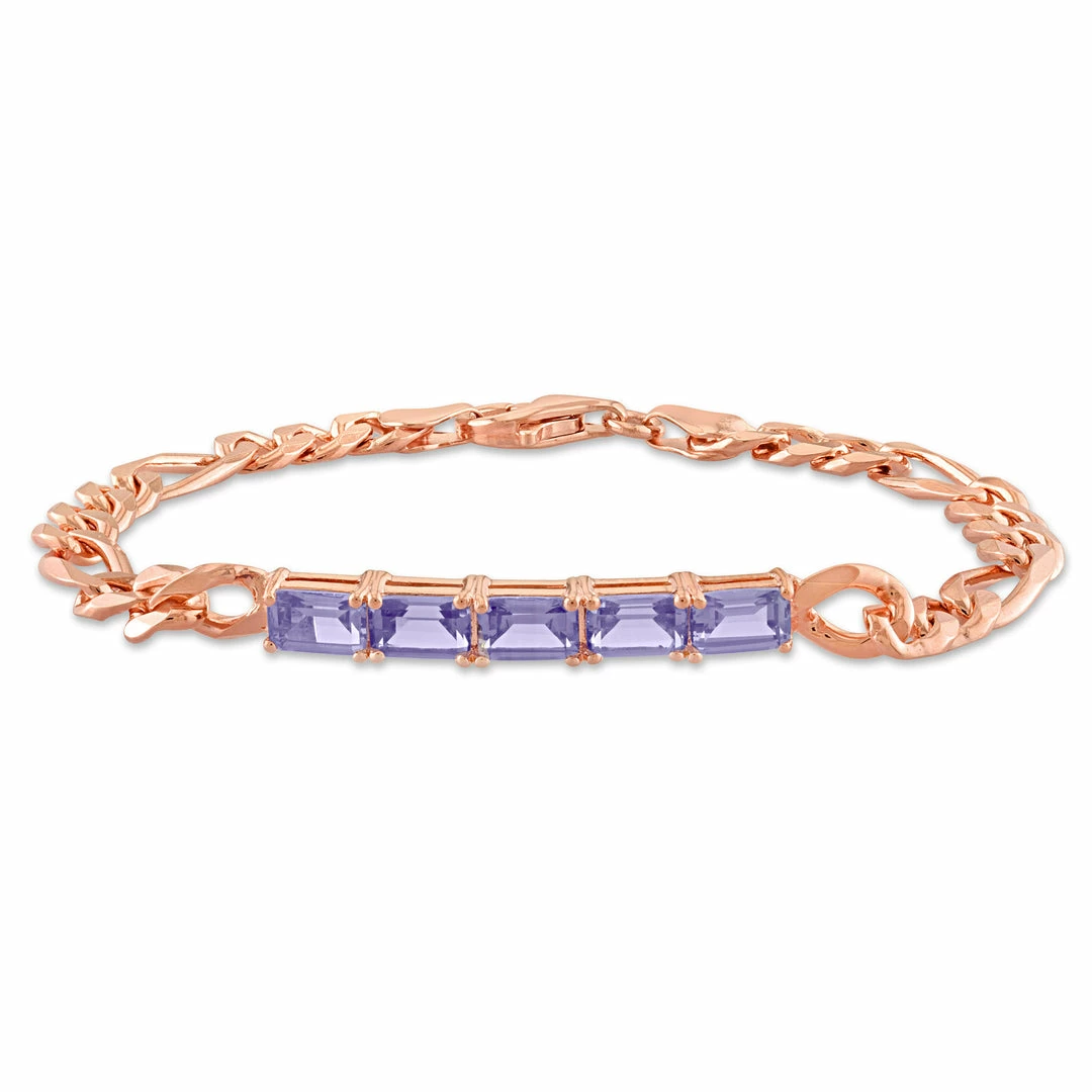 This edgy bar-tennis chain bracelet is crafted in sparkling rose plated sterling silver. This bar bracelet features five octagon-cut, prong-set, glittering created alexrandrite gemstones that are beautifully embellished on the bracelet. This dazzling tennis bracelet is suspended on 7.25-inch figaro chain and secures with a lobster clasp. Coordinate this bracelet with any ensemble for a glamorous look.