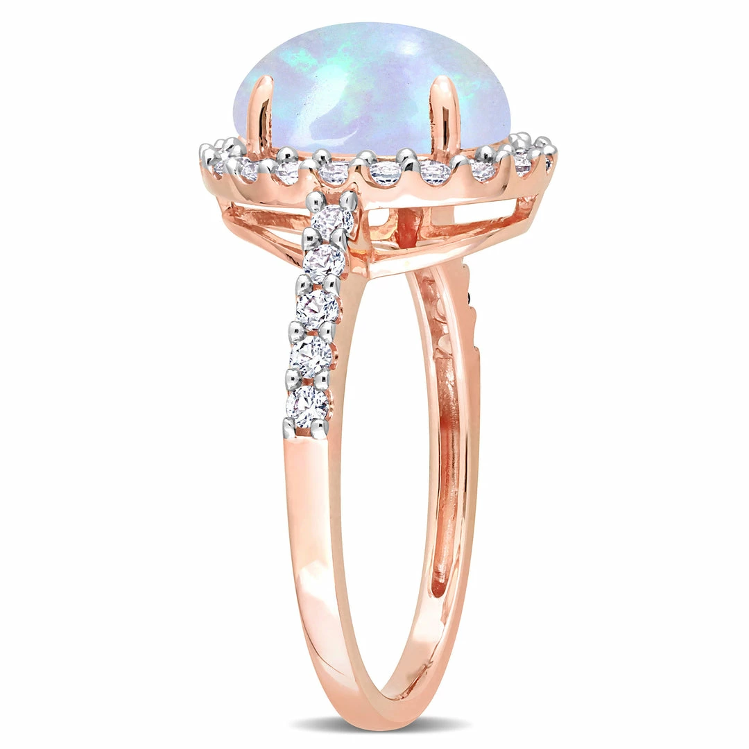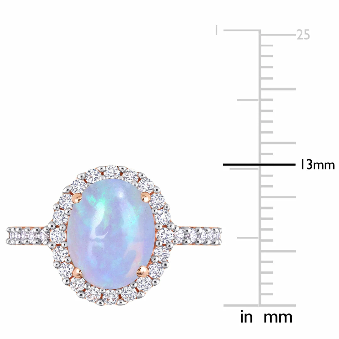 Add a breathtaking piece to your collection with this exceptional halo ring. Crafted in lustrous rose gold, this delicate ring features an oval-cut, prong-set Ethiopian blue opal encased by 30 round, buttercup-set created white sapphire gemstones in a halo design. Enhanced with a polished finish, this ring is a perfect accessory for a dressy occasion.