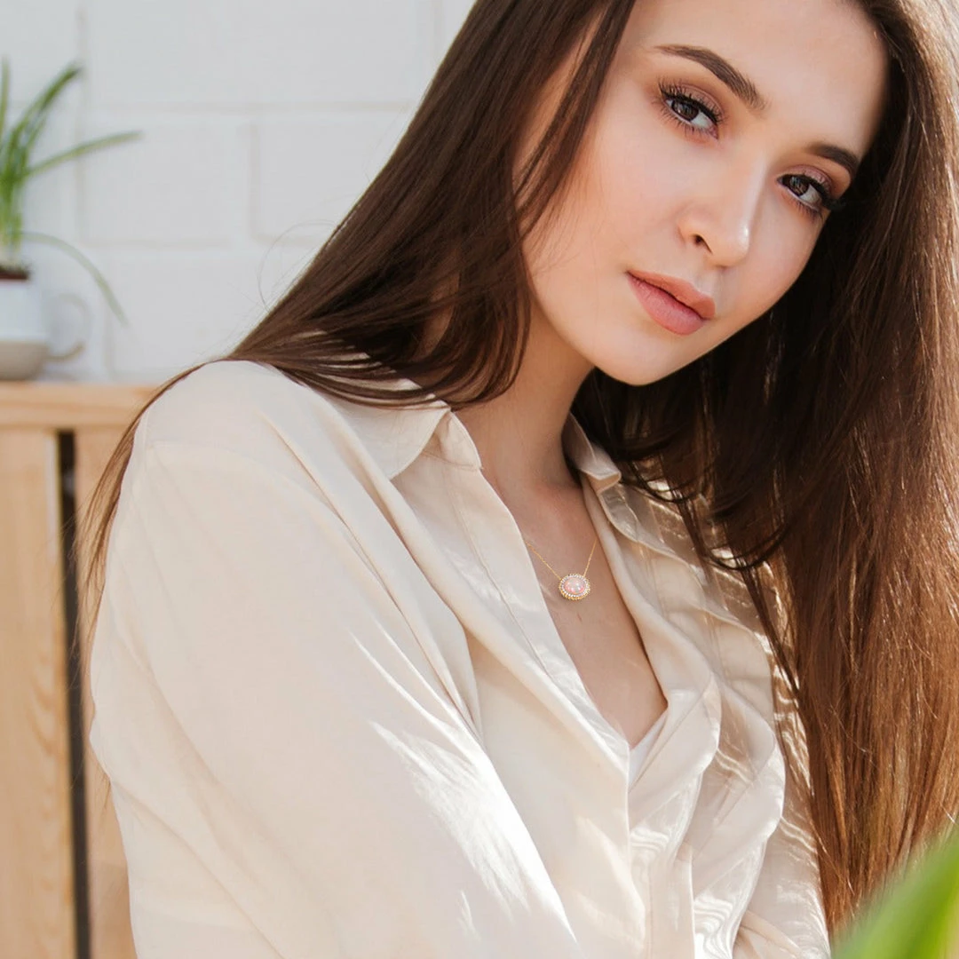 This exquisite opal and diamond beaded halo necklace is crafted in 14-karat yellow gold and features an oval-cabochon cut yellow-hued Ethiopian opal at the center of its 28 diamond studded double beaded halo design. Instantly elevate any ensemble from business casual to formal wear with this stunning gemstone and diamond necklace.