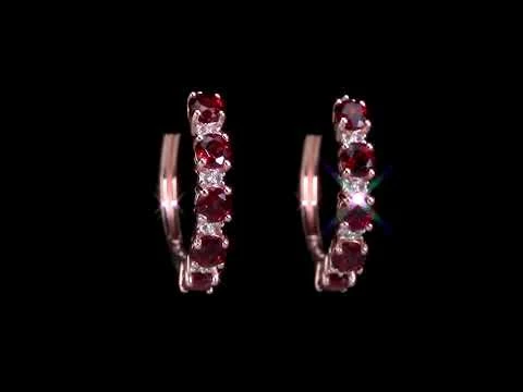 These gorgeous garnet hoop earrings are crafted in rose plated sterling silver.These magnificent earrings feature alternating round cut, prong set garnet and round cut, prong set white topaz gemstones rested on the edge of the hoop.Enhanced with a high polish finish, these amazing birthstone earrings are a perfect addition to any jewelry collection.A beautiful gift choice for that special January birthday in your life.Style – Hoop Gemstone colors – Red, white Gemstone shapes – Round 10 prong set round cut garnet gemstones each measure 4 mm Gemstone weight – 2 7/8 carats 24 prong set round cut white topaz gemstones Gemstone weight – 1/4 carat Total gemstone weight – 3 1/8 carats Metal – Pink plated sterling silver Finish – High polish Clasp – Clip Back Metal weight – 4.05 grams Earring dimensions – 4 mm wide x 22.8 mm long x 23.3 mm deep All carat weights and measurements are approximate and may vary slightly from the listed dimensions.Treatment code N (white topaz, garnet).See Treatment Guide for further information.