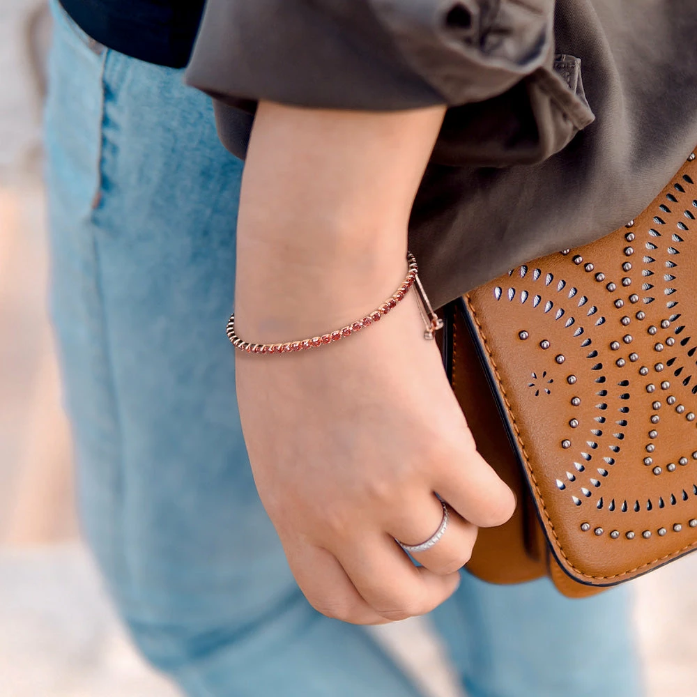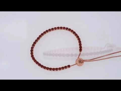 Give a complete look to your outfit with this beautiful garnet bolo bracelet crafted in rose plated sterling silver.It is gently secured with an adjustable tassel to ensure the perfect fit. Style – Charm Gemstone colors – Red Gemstone shapes – Round Two bezel set round cut garnet each measure 3 mm wide Gemstone weight – 1/5 carat 44 prong set round cut garnet each measure 2.5 mm wide Gemstone weight – 2 5/8 carats Total gemstone weight – 2 4/5 carats Metal – Rose plated silver Finish – High polish Chain – Box Clasp – Slide lock Metal weight – 3.9 grams Bracelet dimensions – 2.8 mm wide x 10 inches long x 2.6 mm thick All carat weights and measurements are approximate and may vary slightly from the listed dimensions.Treatment code E (garnet).See Treatment Guide for further information.