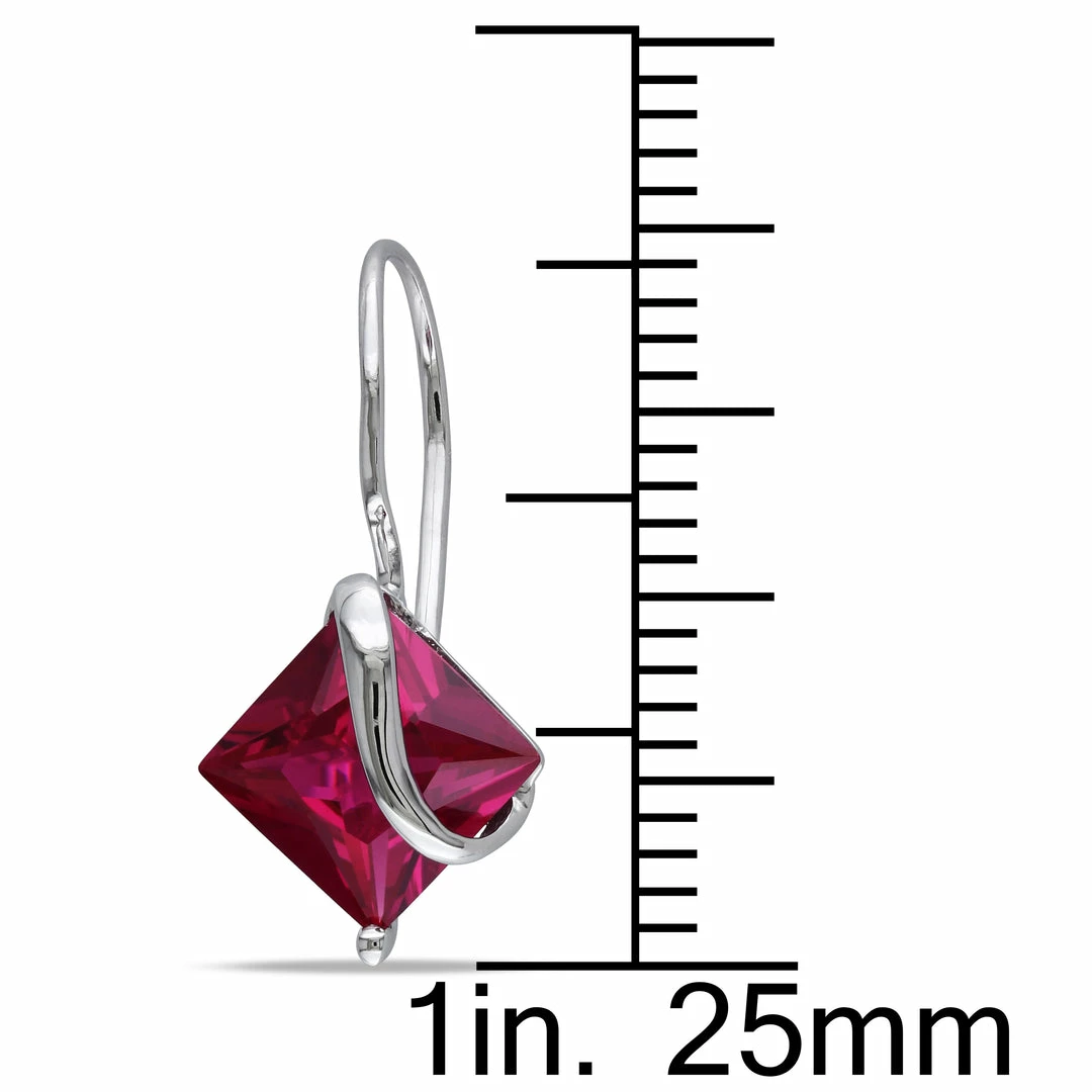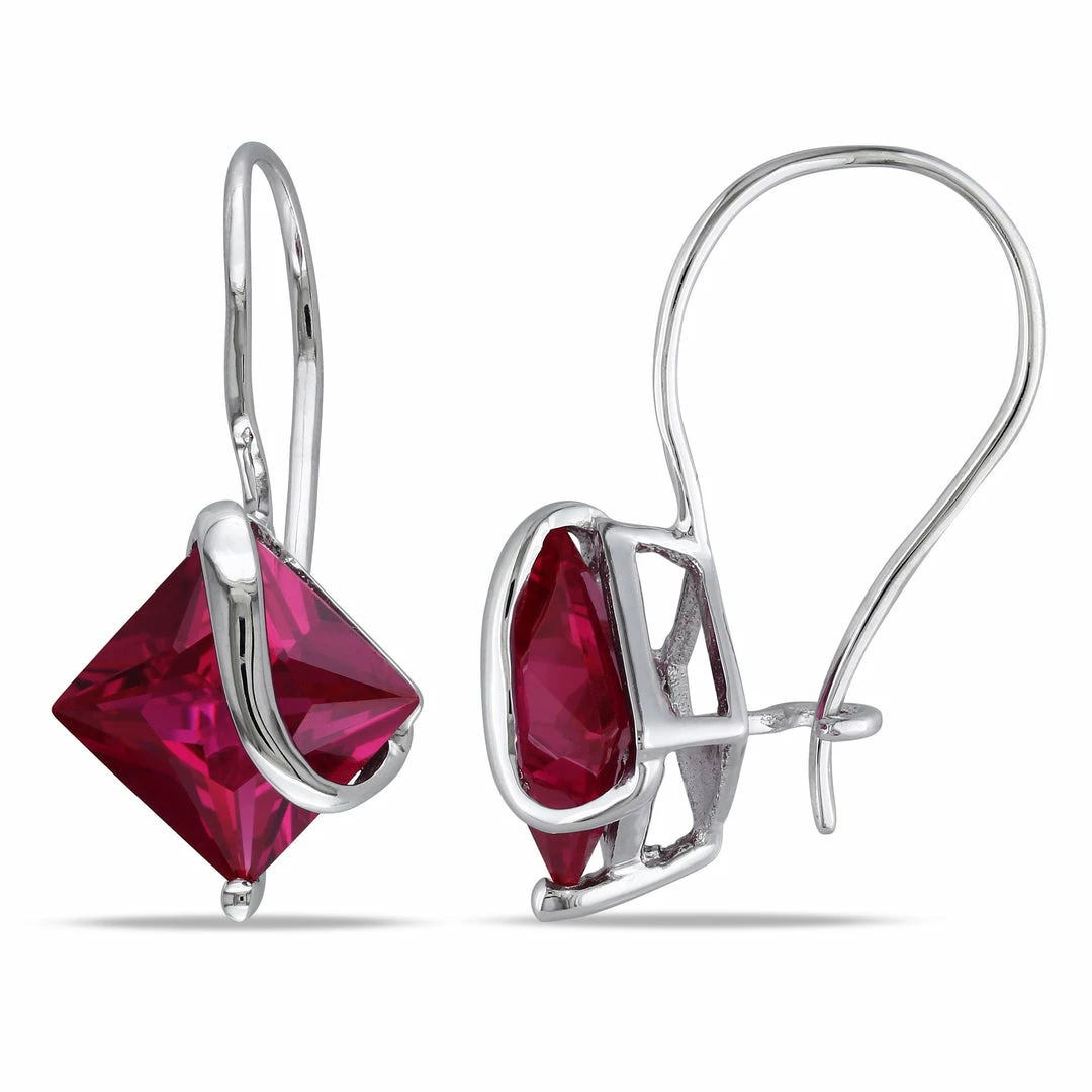 Alluring earrings feature a stylish square design adorned with deep red created rubies Uniquely designed earrings offer a highly fashionable look for your personal style Jewelry is crafted of lustrous 10-karat white gold Two square prong set created rubies measure seven mm Total gem weight is 4 1/10** carat Earrings close with shepherd hook Euro backs All carat weights and measurements are approximate and may vary slightly from the listed dimensions.*T.G.W.(total gem weight) for 4 1/10 carat T.G.W.may range from 4.05 to 4.15 carat.Treatment code CR.See Gemstone Treatments for further information.