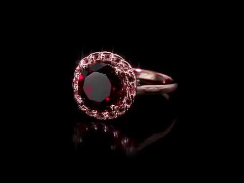 This eye catching solitaire ring is mounted in shimmering rose plated sterling silver.This ravishing ring showcases a prong set, garnet gemstone at the center surrounded by open oval link motifs.Enhanced with a high polished finish, this exceptional ring is perfect for a date night.Stun him with your flawless look accentuated by this impeccable ring.Gemstone colors – Red Gemstone shapes – Round One prong set round cut garnet gemstone Total gemstone weight – 3 carats Metal – Rose plated silver Finish – High polish Style – Solitaire Metal weight – 2.77 grams Ring setting dimensions – 13.2 mm wide x 20.5 mm long x 6 mm high Band dimensions – 1.9 mm wide All carat weights and measurements are approximate and may vary slightly from the listed dimensions.Treatment code N (garnet).See Treatment Guide for further information.This ring cannot be resized.