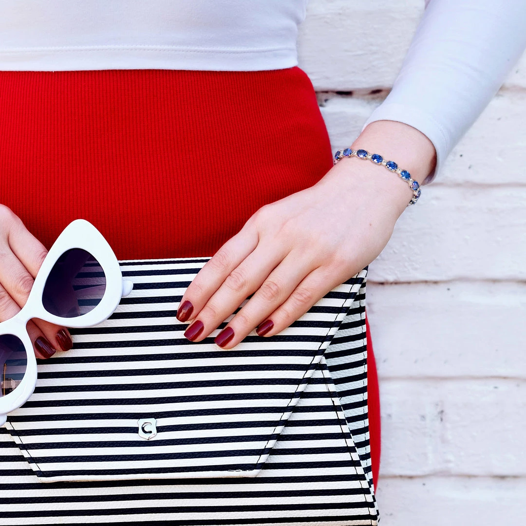 Stand out with this vibrant Created Blue Sapphire and Created White Sapphire Bracelet. Crafted in lustrous sterling silver, it features created blue sapphire gemstones alternating with smaller created white sapphire gemstones forming a line. Enhanced with a high polish finish, this gemstone bracelet measures 7-inch in length and secures with a pressure tongue clasp. This stunning gemstone bracelet is sure to add a burst of color and elegance to any ensemble.