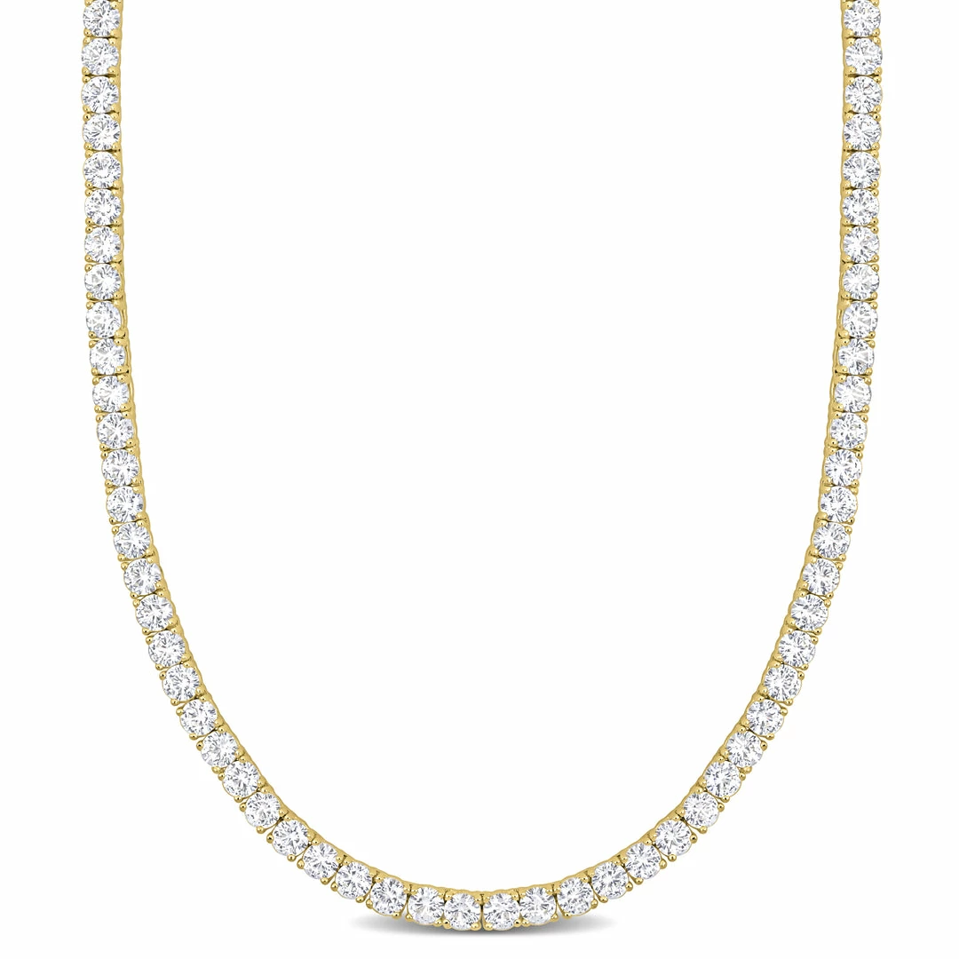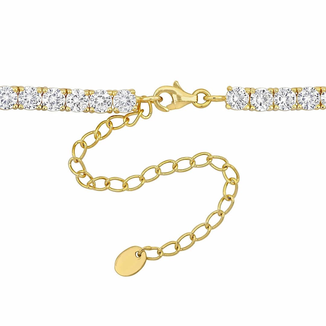 Make a silver lining in your accessories collection with this charming created white sapphire tennis necklace with an extender. This necklace is crafted in gleaming yellow plated sterling silver and features 100 round-cut created white sapphire gemstones in a tennis pattern for a classic look. This exquisite necklace is secured with a lobster clasp and measures 17 inch with an extender of 3 inches. Polished to a brilliant shine, this necklace is sure to give you happiness as you enhance your neck.