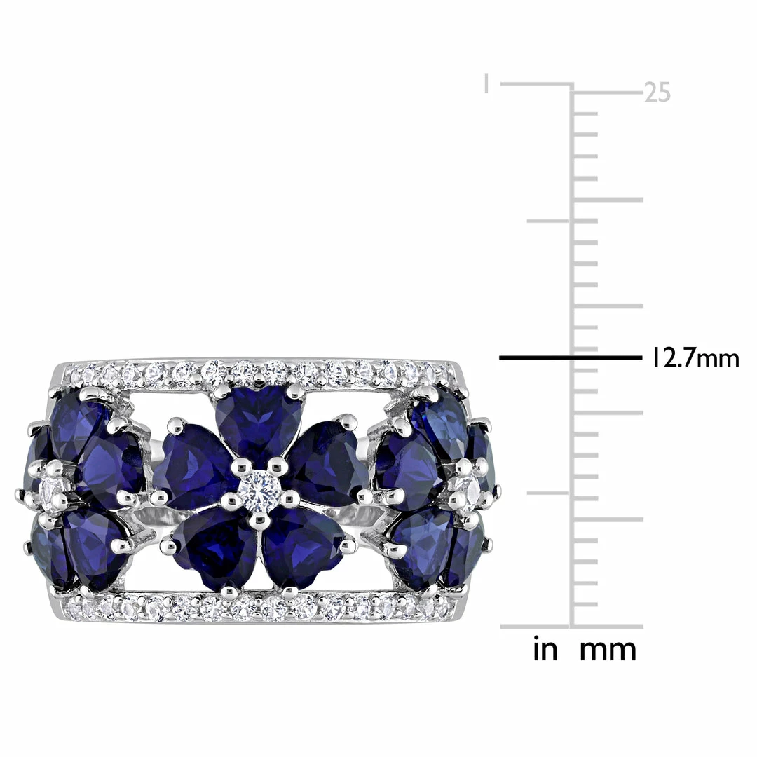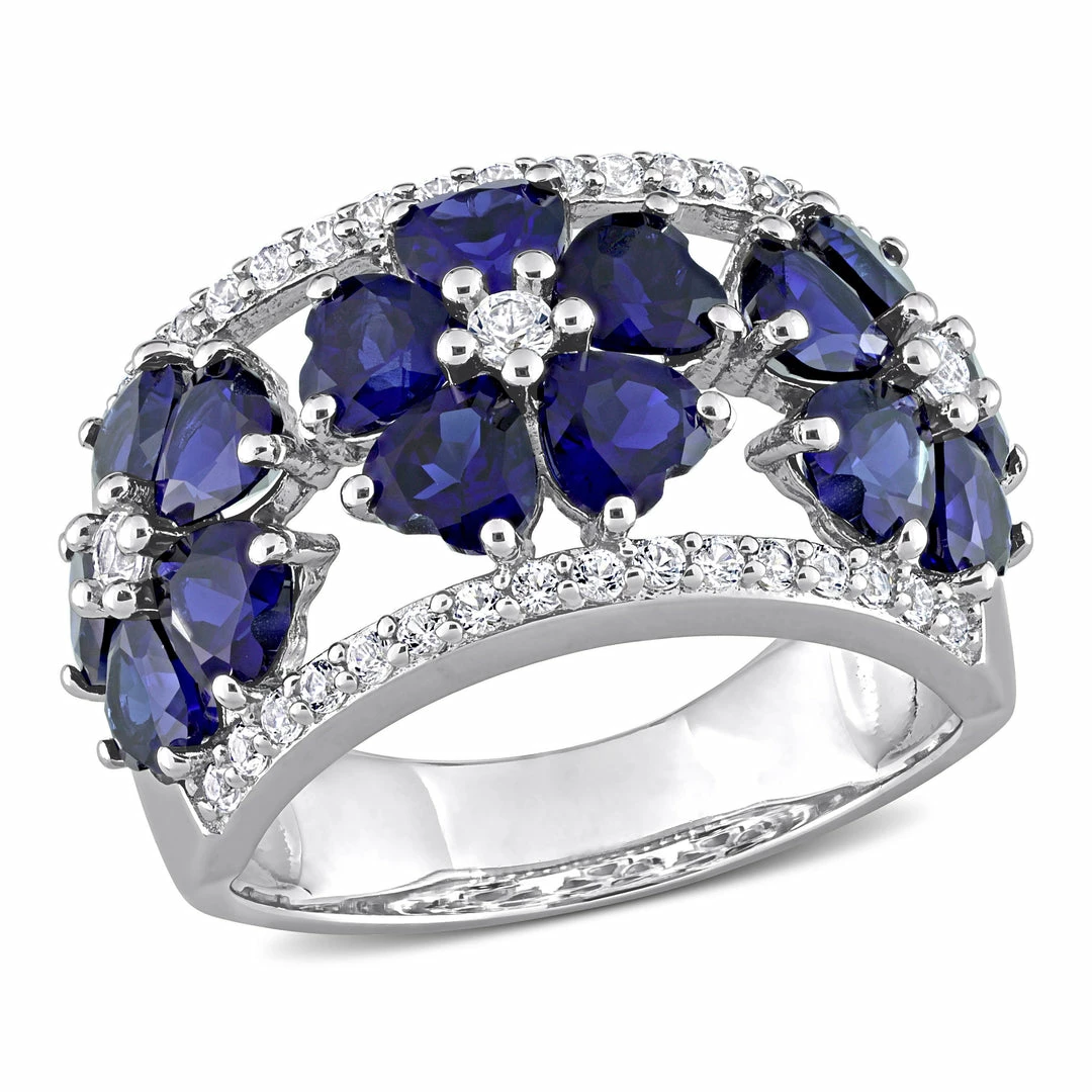 This created sapphire floral cocktail ring is crafted in sterling silver. This modern ring features 15 heart-cut created blue sapphires along with 35 round-cut created white sapphires in a unique triple flower semi-eternity design. Instantly add a touch of color, elegance and class to any ensemble with this stunning gemstone ring. A perfect choice either for yourself or as a special gift for someone you love. This statement ring will make a standout addition to any jewelry collection.