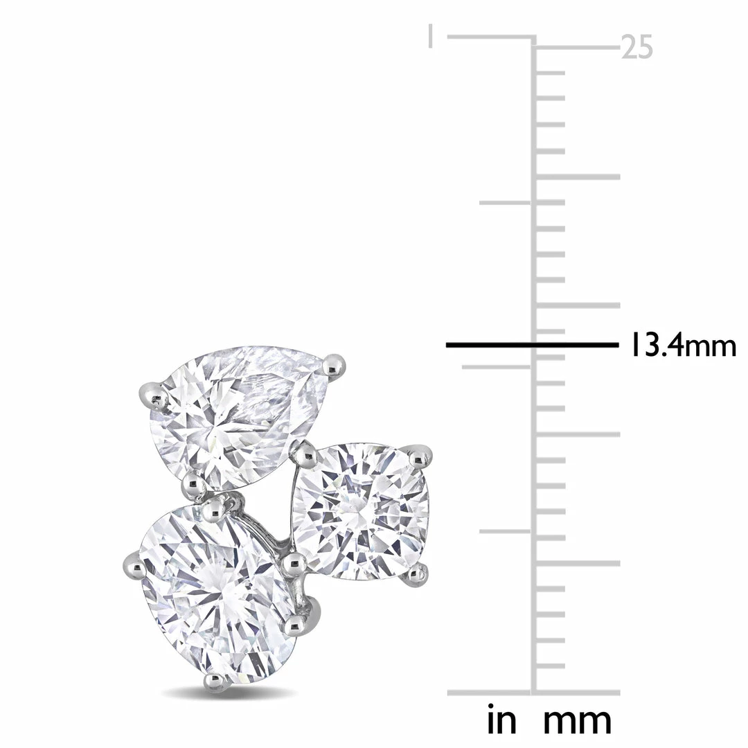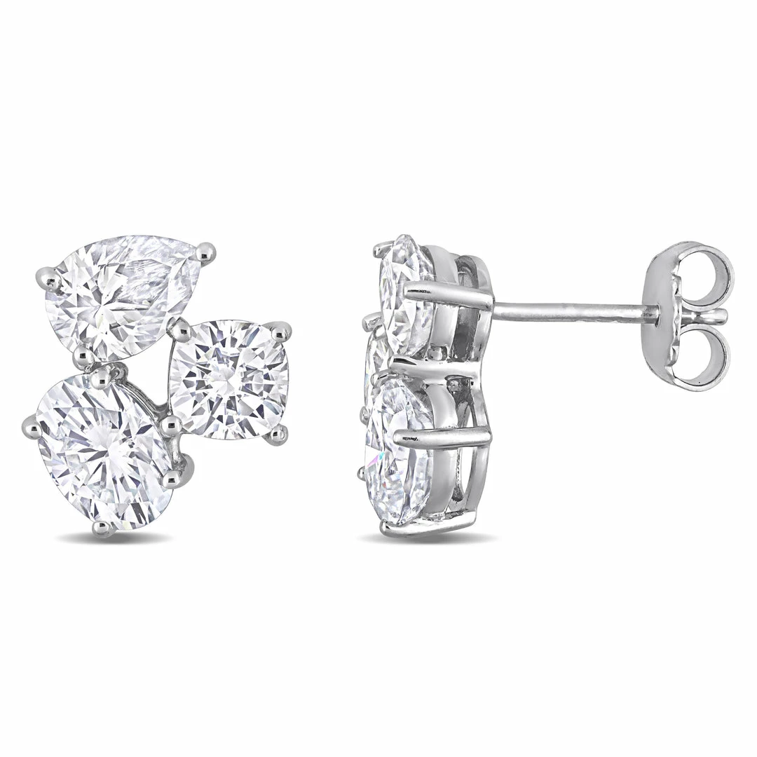 These multi-cut moissanite three-stone stud earrings are crafted in lustrous sterling silver. These elegant earrings feature two oval-cut, two pear-cut and two cushion-cut, prong-set created white moissanite gemstones in a unique three-stone clustered stud design. Enhanced with a high polish finish, these moissanite earrings are secured with butterfly backs and are a great addition to any jewelry collection. Choose these modern gemstone earrings as a perfect choice either for yourself or for someone you love.