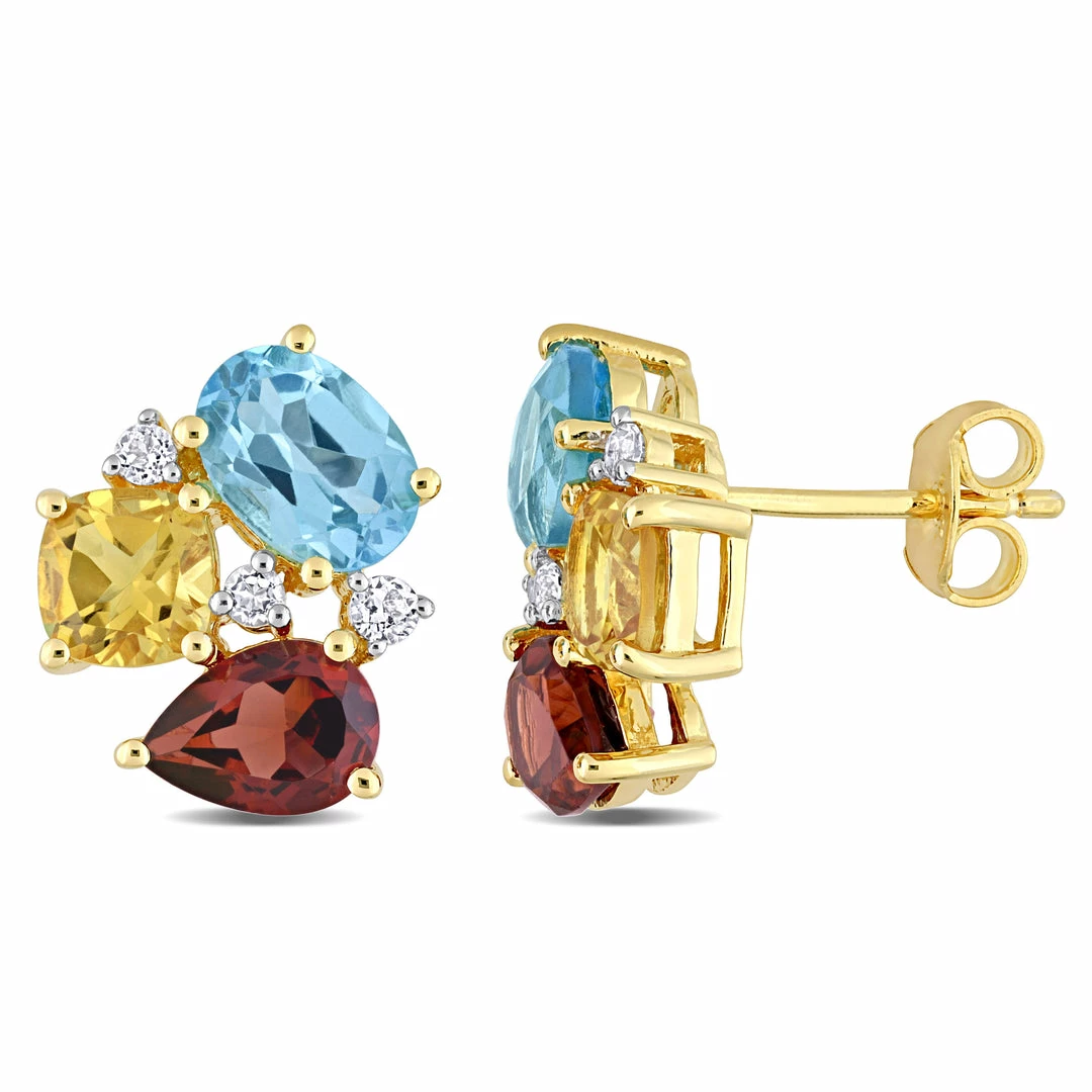 These beautiful multi-color gemstone cluster stud earrings are crafted in yellow plated sterling silver. These charming earrings feature pear-cut garnet, oval-cut Swiss-blue topaz, cushion-cut citrine and round-cut white topaz gemstones in a unique clustered design. Enhanced with a high polish finish, these modern stud earrings are secured with butterfly backs. This vibrant pair of earrings is a great addition to any jewelry collection.
