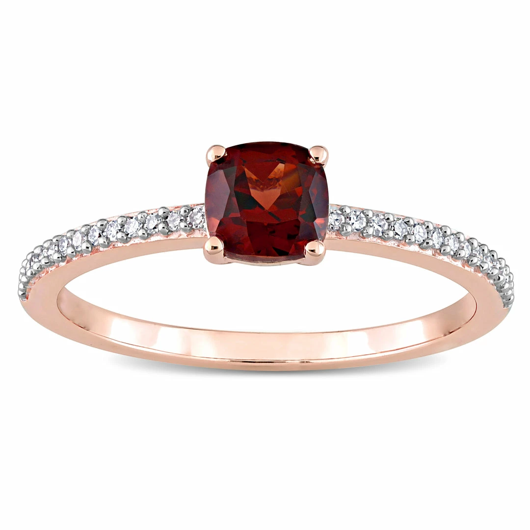 This glamorous solitaire engagement ring is crafted in 10-karat rose gold to add a touch of refinement an elegant style to you look.This attractive wedding ring features a sumptuous cushion cut garnet stone raised over the delicate shank with 28 round cut, prong set white diamonds adding shimmer along its high polished band.Instantly add a touch of color, sophistication and class to any ensemble with this stunning gemstone bridal ring.This birthstone ring is sure to make a standout addition to any jewelry collection.Whether worn as a promise ring, engagement ring or simply a gorgeous gemstone accessory, this gemstone and diamond ring is a great gift for a woman with a classic and trendy sense of style.Center stone Gemstone – Garnet Number of gemstones – One Gemstone cut – Cushion Gemstone weight – 5/8 carat Gemstone setting – Prong Side stones Diamonds – 28 Diamond cut – Round Diamond weight – 1/10 carat Color – G H Clarity – I2-I3 Setting – Prong Metal information and dimensions Metal – 10k pink gold Finish – High polish Style – Side stones Metal weight – 1.51 grams Ring setting dimensions – 5 mm wide x 20.7 mm long x 5 mm high Band dimensions – 1.5 mm wide Diamond total weight – 1/10* carat TW All weights and measurements are approximate and may vary slightly from the listed information.*T.W.(total weight) is approximate.1/10 carat T.W.may be 0.08 to 0.12 carat.Treatment code N (Garnet, white diamond).See Treatment Guide for further information.