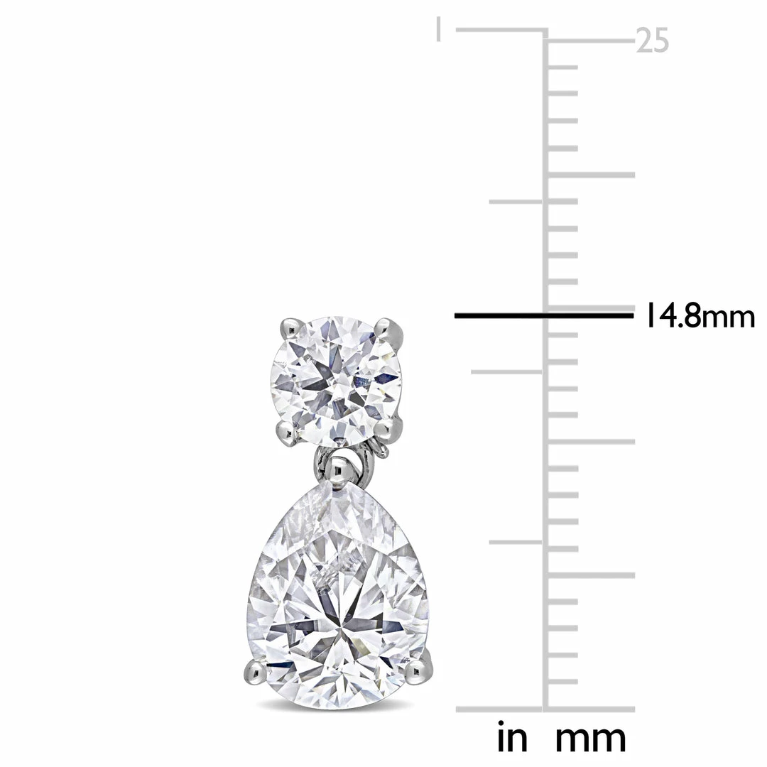 These moissanite two-stone stud earrings are crafted in sterling silver. These elegant earrings feature two round-cut and two pear-cut created white moissanite gemstones in a classic two-stone stud design. Enhanced with a high polish, these earrings are a perfect addition to any jewelry collection. These gemstone earrings will add style and class to your look.