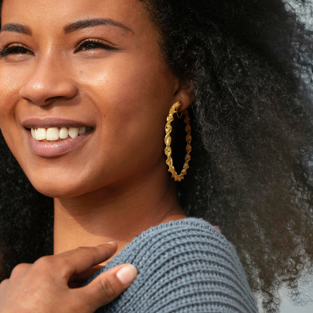 Make a shimmering style statement with these Twisted Hoop Earrings. Crafted in lustrous yellow gold and feature braided designer hoops. Polished to a brilliant shine, these hoop earrings are secures with clip-in closures. Give yourself a glamorous look with these trendsetting and unique twisted hoop earrings. Make yourself feel stunning by wearing these gorgeous hoop earrings.