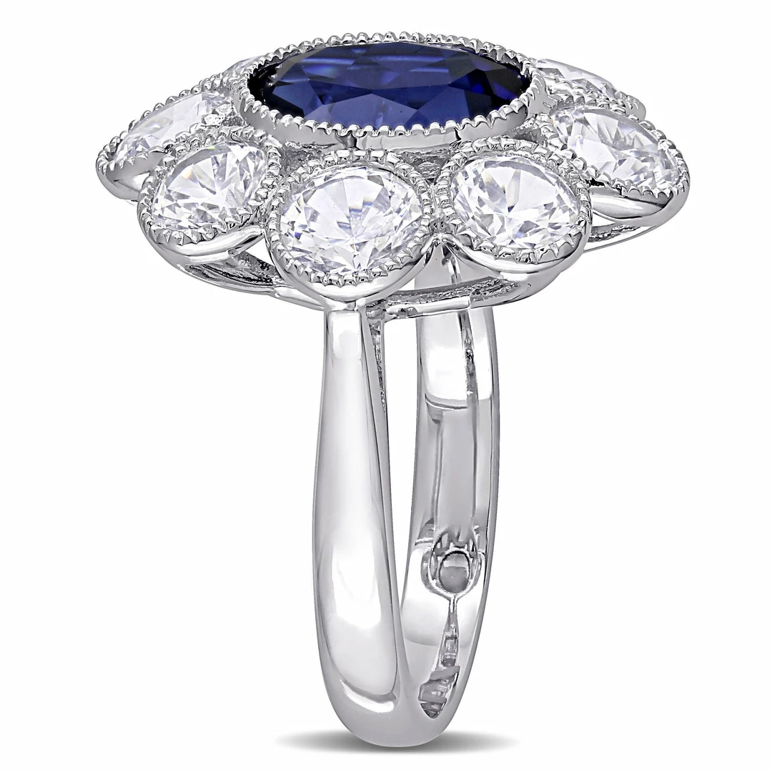 This bold and bright created blue and white sapphire flower cocktail ring is crafted in 10-karat white gold and features an oval-cut, bezel-set created blue sapphire gemstone at its center surrounded by eight round-cut, bezel-set created white sapphire gemstones in an exquisite floral statement design. With vibrant gemstone colors and brilliant luster, this gemstone cocktail ring is sure to make a standout addition to any jewelry collection.