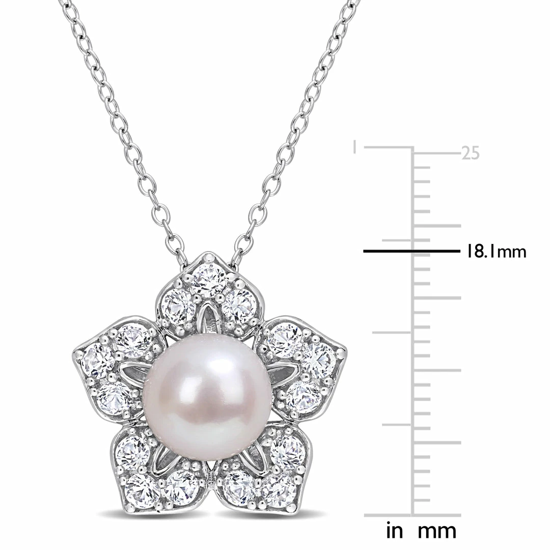 This pearl flower halo necklace is crafted in sterling silver and features a single cultured freshwater pearl at the center of its 15 round-cut, pave-set created white sapphires in a unique floral design. Enhanced with a high polish finish, this pendant is hung on a cable chain and secured with a spring ring clasp. This stunning necklace is the perfect addition to any jewelry collection.