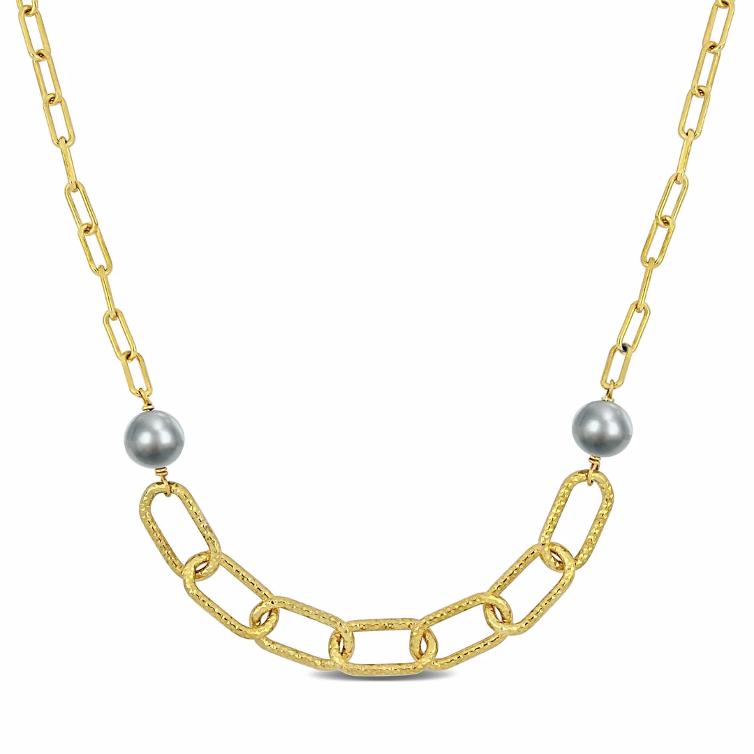 Flaunt your unique style accentuated by this Paperclip Necklace. Crafted in lustrous yellow gold plated sterling silver, this stylish necklace showcases two off round-shaped, grey cultured freshwater pearls (9-10 mm) placed on a 20-inch oval link chain which is secured with a lobster clasp. Enhanced with a high polished finish, this exceptional necklace from the pearl and fancy chain collection is sure to compliment the beauty of your favorite western outfit.