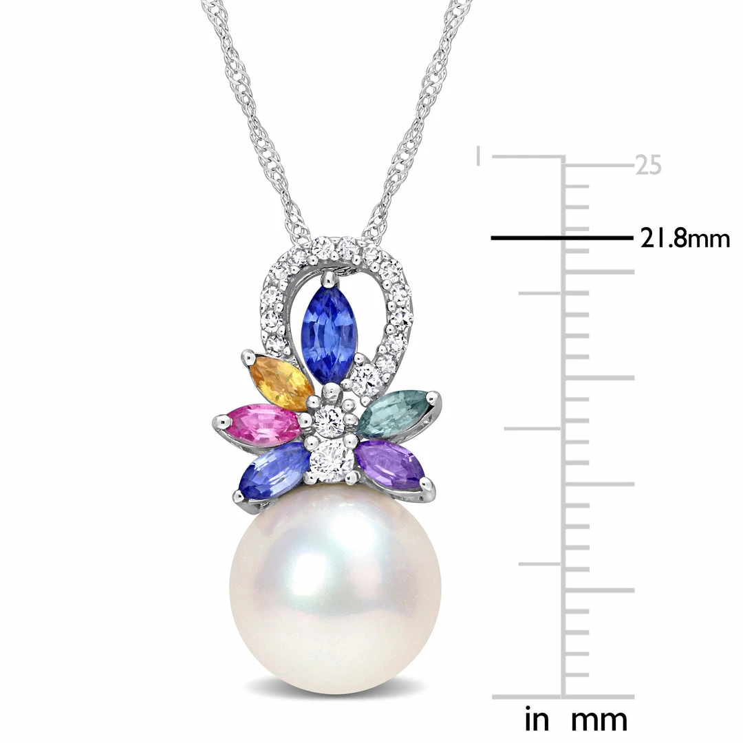 Deals ✔️ Mimi & Max 9.5-10 MM Cultured Freshwater Pearl and 4/5 CT TGW Multi Sapphire (Light Blue, White, Yellow, Pink, Purple & Green) and Diamond Accent Flower Pendant with Chain in 14k White Gold for 👩 women 🔔