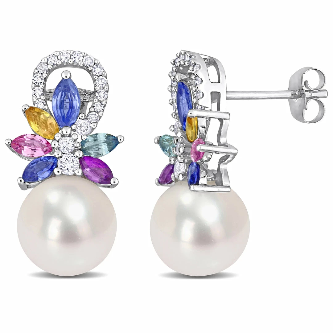 Wholesale 🤩 Mimi & Max 9-9.5 MM Cultured Freshwater Pearl and Multi Sapphire (Light Blue, White, Yellow, Pink, Purple & Green) and 1/8 CT TW Diamond Flower Drop Earrings in 14k White Gold for 👩 women 😀