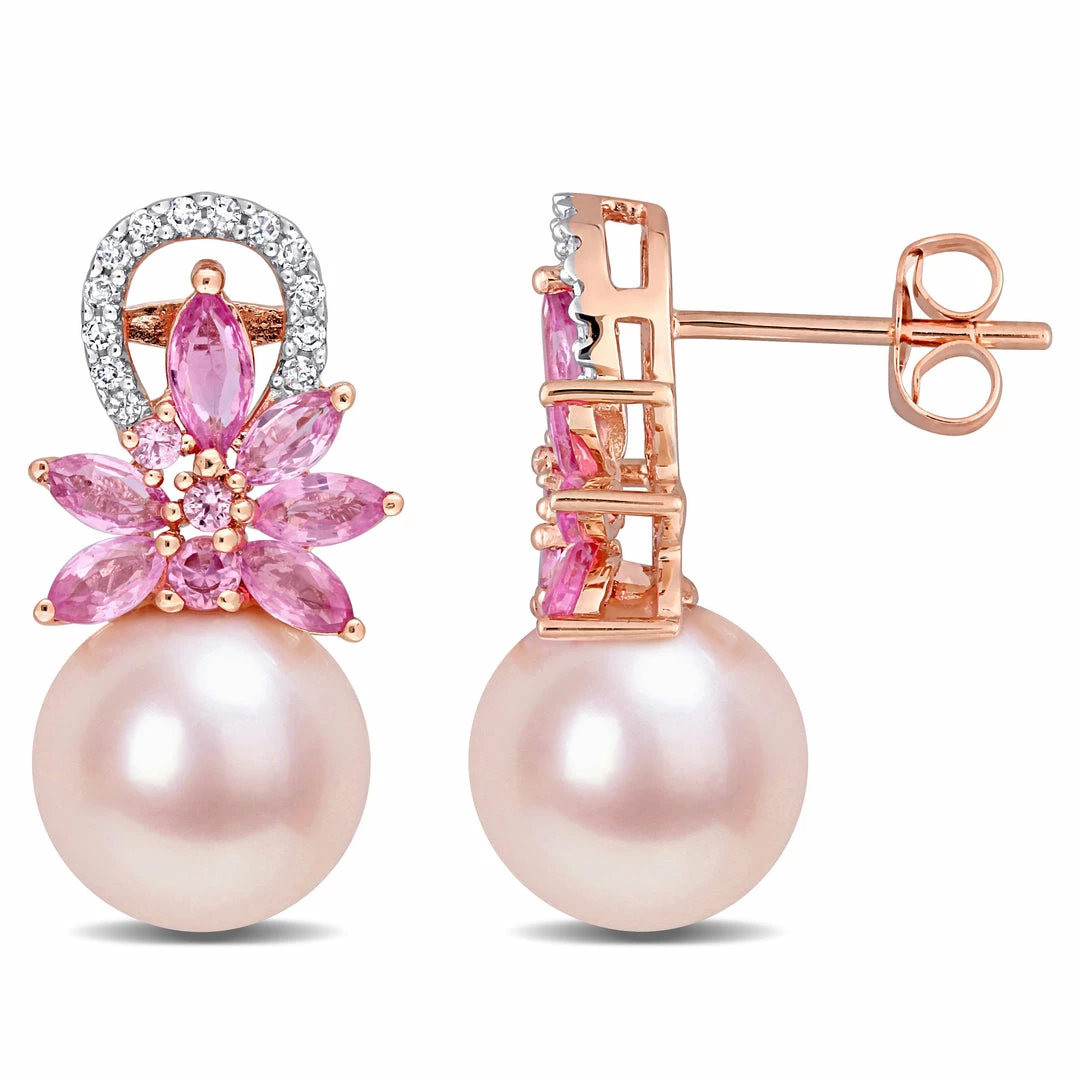 Promo ๐ฅฐ Mimi & Max 9-9.5 MM Pink Cultured Freshwater Pearl and Pink Sapphire and 1/8 CT TW Diamond Flower Drop Earrings in 14k Rose Gold for ๐ฉ women ๐