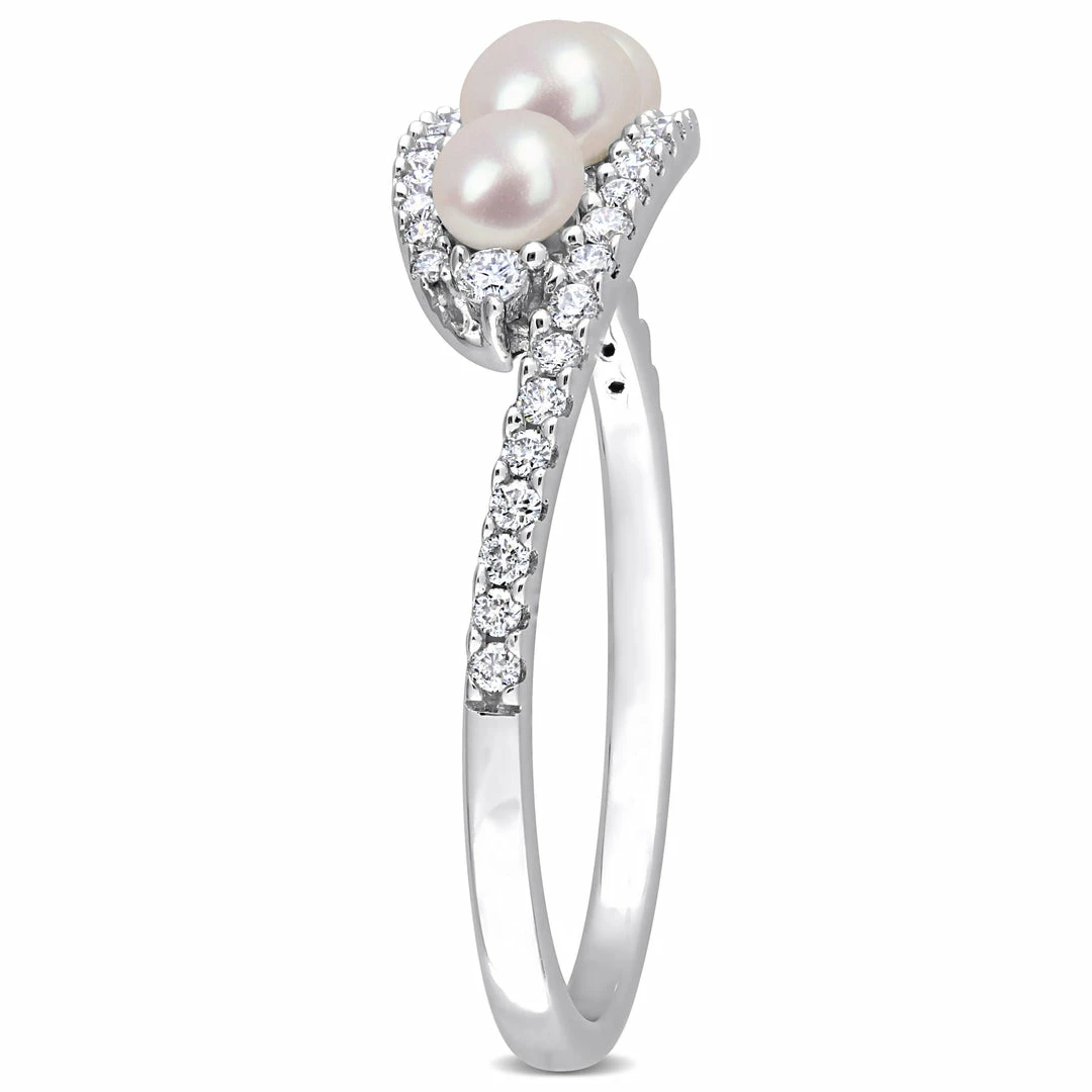 This pretty pearl three-stone bypass ring is crafted in 14-karat white gold and features three beautiful white freshwater cultured pearls stud inside the bypass pattern with 38 buttercup-set and two prong-set, round-cut diamonds around it. Enhanced with a high polish finish, this pearl and diamond ring is a stunning addition to any jewelry collection. Coordinate this modern ring with any ensemble for a more elegant and sophisticated look. A perfect gift for that special June birthday in your life.