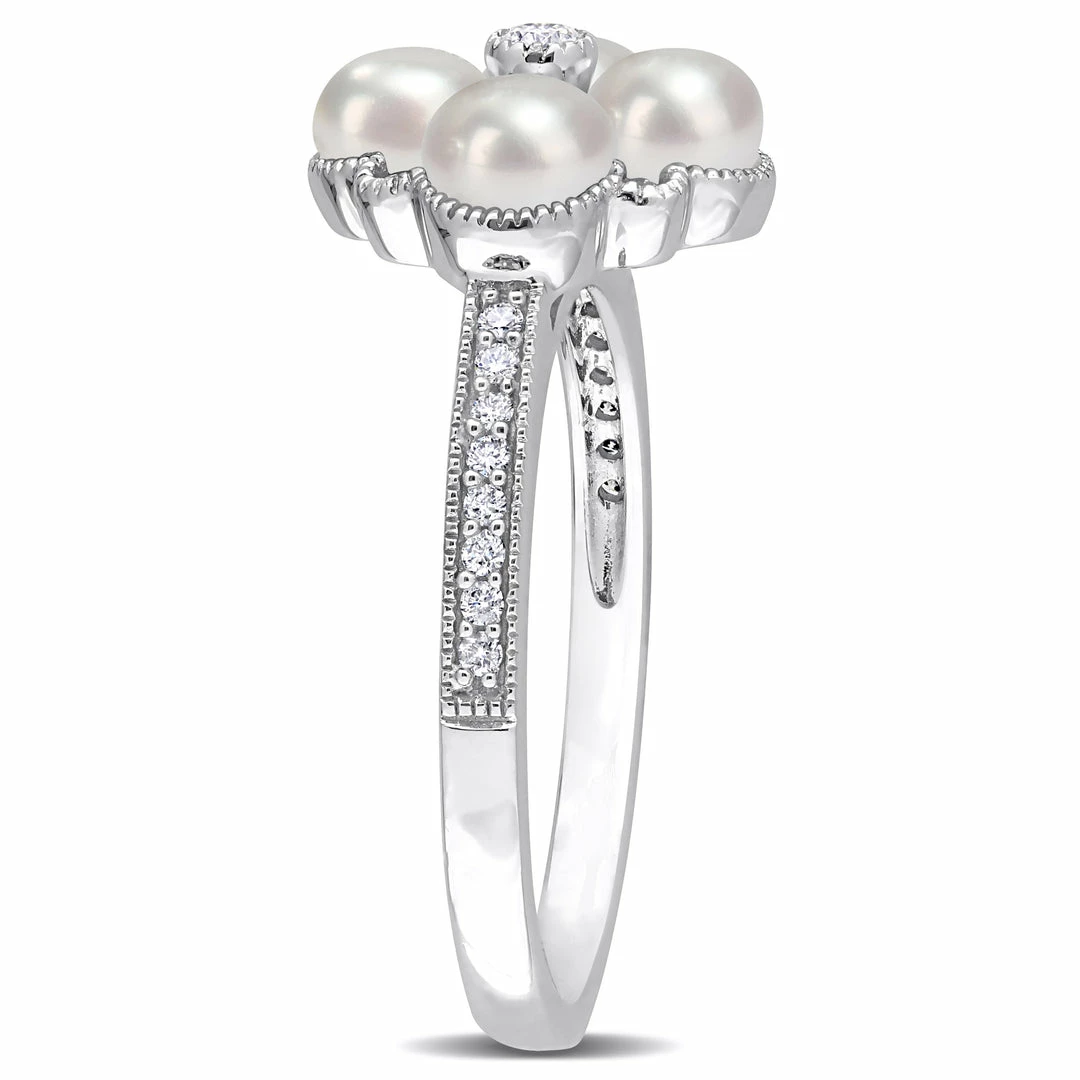 This pretty pearl and diamond floral ring is crafted in 14-karat white gold and features four freshwater cultured pearls in a floral design with five bezel-set and 16 pave-set diamonds adding shimmer and shine. Enhanced with a high polished finish, this floral ring will add a touch of class to any outfit. A splendid addition to your jewelry collection.