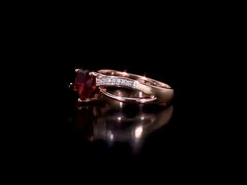 This lovely ring from the Collection features a heart cut garnet center stone adorned with round white diamond accents set in 10-karat rose gold.This glamorous ring is enhanced with a high polish finish.Gemstone colors – Red Gemstone shapes – Heart One prong set heart cut garnet measures 7 mm wide x 7 mm long Total gemstone weight – 1 2/5 carats Diamonds – 17 Diamond cut – Round Diamond weight – 0.051 carat Color – H I Clarity – I2-I3 Setting – Pave Metal – 10k rose gold Finish – High polish Metal weight – 2.9 grams Ring setting dimensions – 19.1 mm wide x 7.8 mm long x 5.2 mm high Band dimensions – 2.5 mm wide Diamond total weight – 0.051* carat TW All weights and measurements are approximate and may vary slightly from the listed information.*T.W.(total weight) may vary and is a minimum of 0.046 carat.Treatment code N (garnet, white diamonds).See Treatment Guide for further information.Click here for ring sizing guide