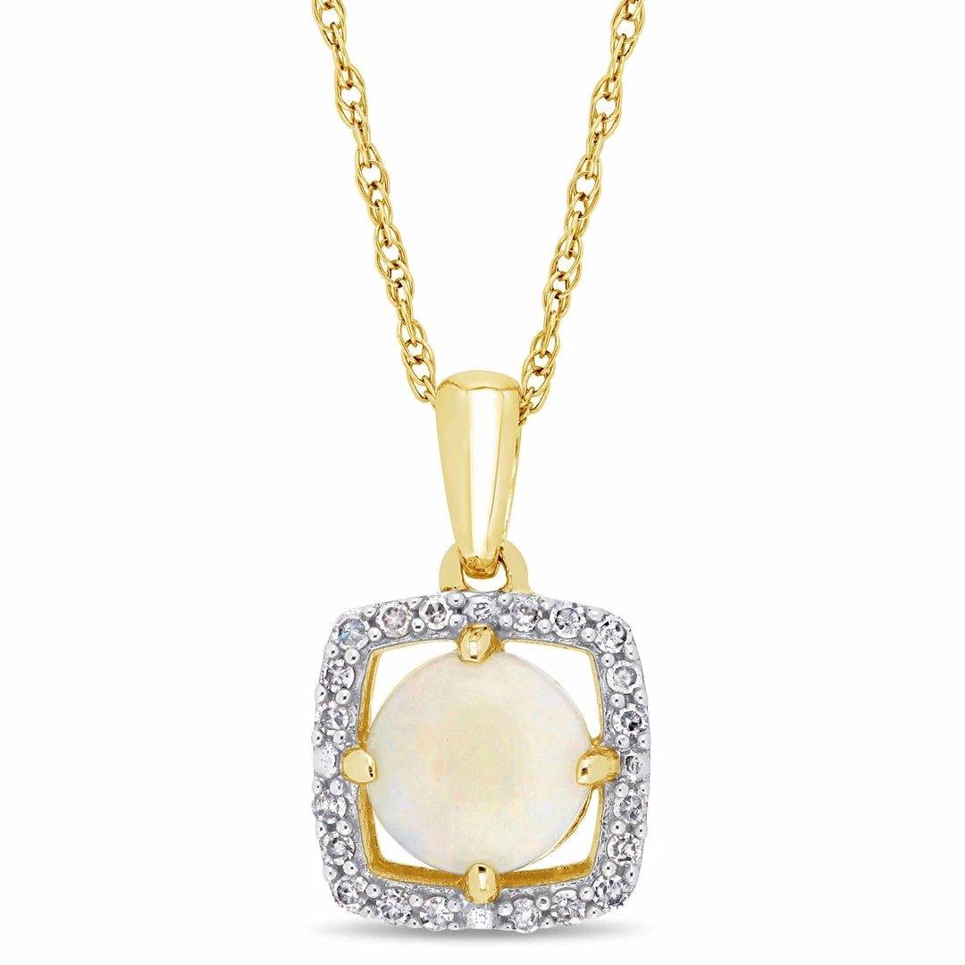 Flaunt your taste and style in this Opal and Diamond Halo Pendant. Crafted in shimmering yellow gold, it features a round-cut, prong-set opal gemstone (6 x 6 mm) at the center surrounded by 20 round-cut, prong-set diamonds (G-H, I2-I3), giving it a sparkling look and forming a halo. Enhanced with a high polish finish, this flattering gemstone and diamond pendant is suspended on a 17-inch rope chain that secures with a spring ring clasp. This opal and diamond pendant is an elegant piece of jewelry, suitable for any occasion.